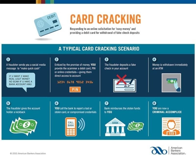 Banks and law enforcement are cracking down on an emerging scam known as “card cracking.” Card cracking is a form of fraud where consumers respond to an online solicitation for “easy money” and provide a debit card for withdrawal of fake check deposits.