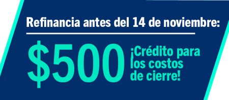 Reciba un crédito de $500 para costos de cierre1 en un refinanciamiento hipotecario cuando solicite y fije una tasa antes del14 de noviembre Revisaremos su hipoteca actual para averiguar si la refinanciación puede ahorrarle dinero al: