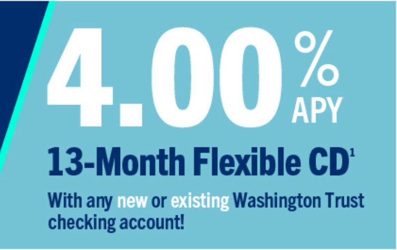 1 4.00% Tasa de Rendimiento Porcentual Anual (APY) 13-month Flexible CD rate is effective as of 11/22/24. Se requiere una cuenta corriente de Washington Trust. Oferta disponible en sucursal sólo para cuentas nuevas abiertas con fondos de fuentes distintas a Washington Trust. La oferta es por tiempo limitado y puede ser retirada en cualquier momento. No se aceptan cuentas IRA ni fondos municipales o gubernamentales. El saldo mínimo para abrir una cuenta es de $500. El saldo mínimo para ganar el APY indicado es de $0.01. Las comisiones pueden reducir las ganancias. Depósitos ilimitados y retirada única - A los siete (7) días o después del día inicial del depósito, puede realizar una retirada parcial única del capital sin penalización por retirada anticipada. El saldo de capital no debe ser inferior a 500 $, de lo contrario estará sujeto a una penalización por retirada anticipada y al cierre de la cuenta. La retirada no puede superar los 10.000 $ del saldo de capital. Cualquier importe retirado superior a 10.000 $ estará sujeto a una penalización por retirada anticipada. Las retiradas posteriores del capital estarán sujetas a todas las penalizaciones por retirada anticipada aplicables. Puede realizar depósitos ilimitados en su cuenta antes del vencimiento. No se permiten los depósitos ACH, las transferencias electrónicas entrantes ni los depósitos en cajeros automáticos.