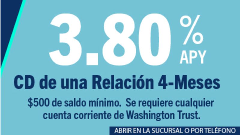 4 El rendimiento porcentualanual (APY) es efectivo a partir del 13/2/2026. La oferta es por tiempo limitado y puede retirarse en cualquier momento. No se admiten fondos municipales ni gubernamentales. El saldo mínimo para abrir la cuenta es de 500 $ de fondos que no sean de Washington Trust. El saldo mínimo para obtener el APY indicado es de 0,01 $. Los retiros de CD antes de la fecha de vencimiento reducirán el APY obtenido y se impondrán penalizaciones por retiro anticipado. Las comisiones pueden reducir las ganancias. Disponible para abrir en sucursal o por teléfono. Se requiere una cuenta corriente de Washington Trust. Solo dinero nuevo; los fondos deben provenir de fuentes distintas a Washington Trust.
