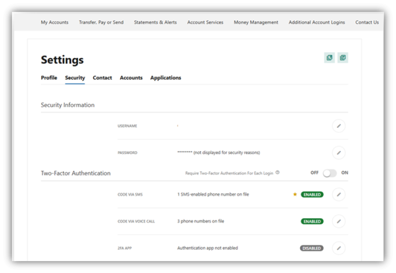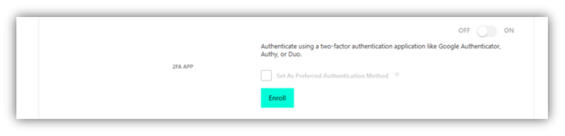 Select Security from the tabs along the top. Within the screen, note the 2FA App is disabled. Click the Pencil icon to enable.