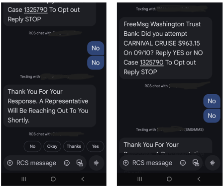 The fraudulent website is designed to look like the Washington Trust website but does not use the washtrust.com domain. If you have received one of these texts, do not visit this website and delete the text immediately. If you have not clicked any links, or visited the fraudulent website, no further action is necessary.